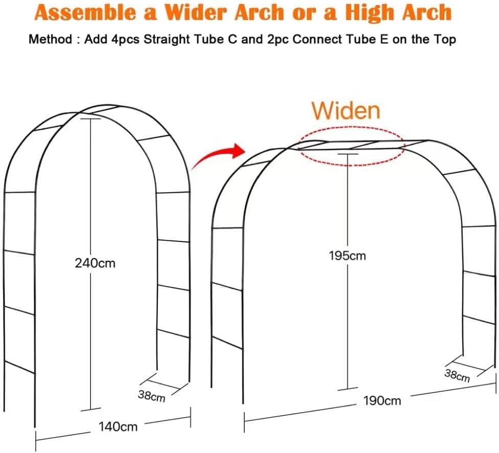 1.One or Multiple Arches: This garden arch is Dark Green, can use to a wider arch(7.5 feet Wide * 6.4 Feet High ) or a high arch (4.6 Feet Wide*7.9 Feet High) by using connection tubes.