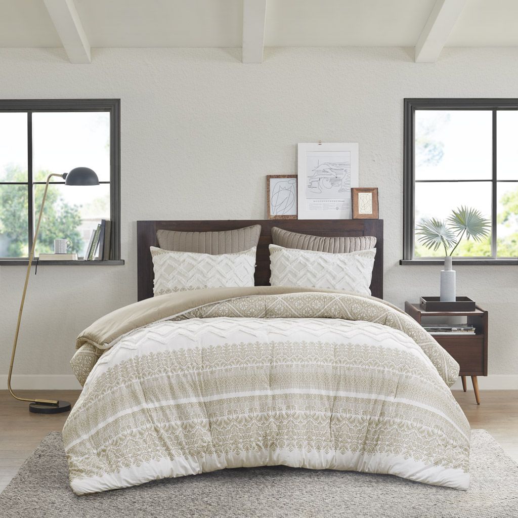 Transform you bedroom with the charming shabby chic allure of the INK+IVY Mila 3 Piece Cotton Comforter Set with Chenille Tufting. The cotton comforter flaunts an updated taupe botanic print, on a natural white ground, with tufted white chenille, in a chevron design, to create a charming farmhouse look. A solid taupe reverse complements the top of the comforter, while hidden bartacking secures the hypoallergenic polyester filling without visible line for a clean finish. Two matching shams beautifully mimic the design of the comforter, completing the farmhouse comforter set. Machine washable, this cotton tufted comforter set offers soft comfort and a vivid touch that elevates your bedroom decor. This comforter is OEKO-TEX certified, meaning it does not contain any harmful substances or chemicals to ensure quality comfort and wellness.