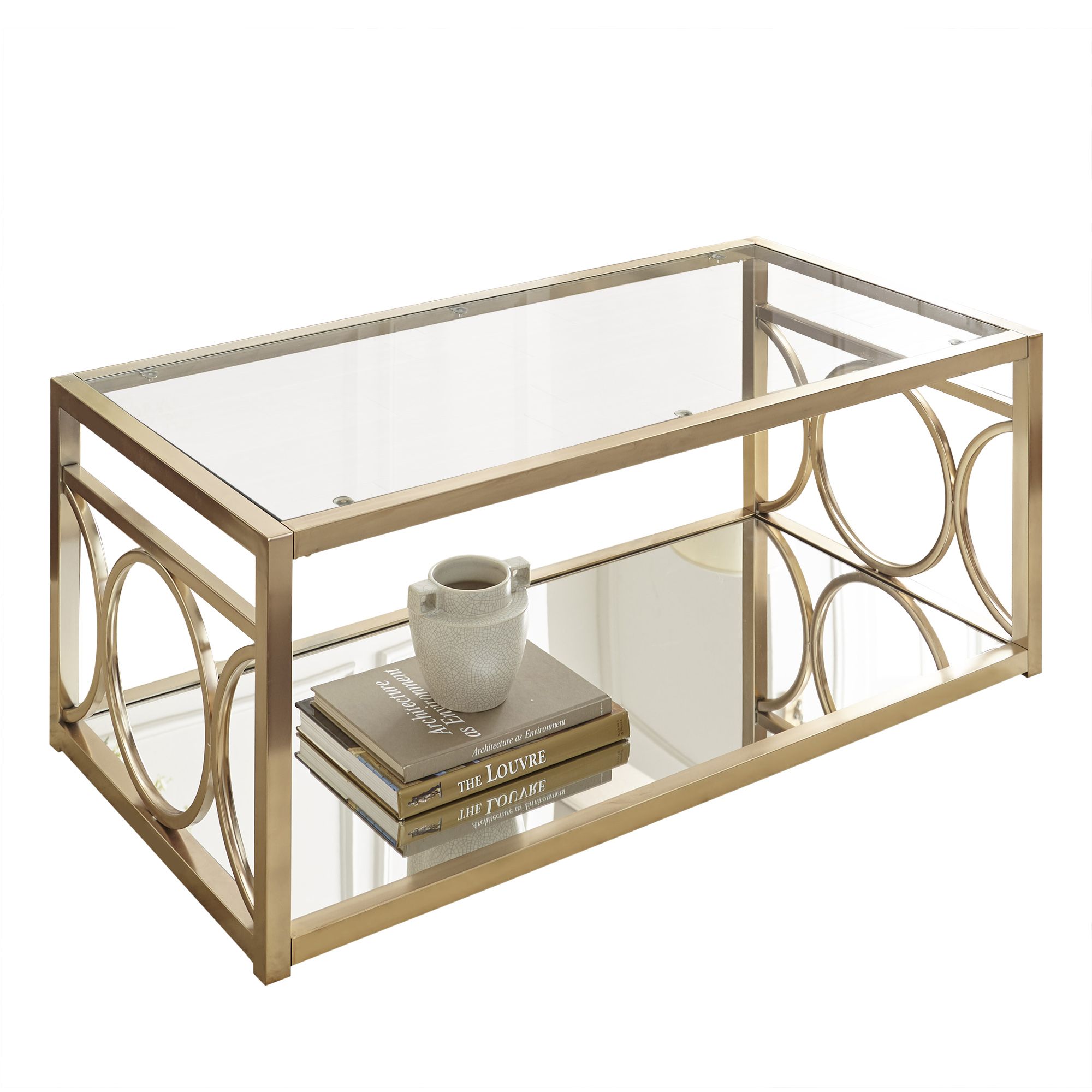 Styling details include contemporary styling in gold chrome finish with concentric circles, glass tops and mirrored bottoms