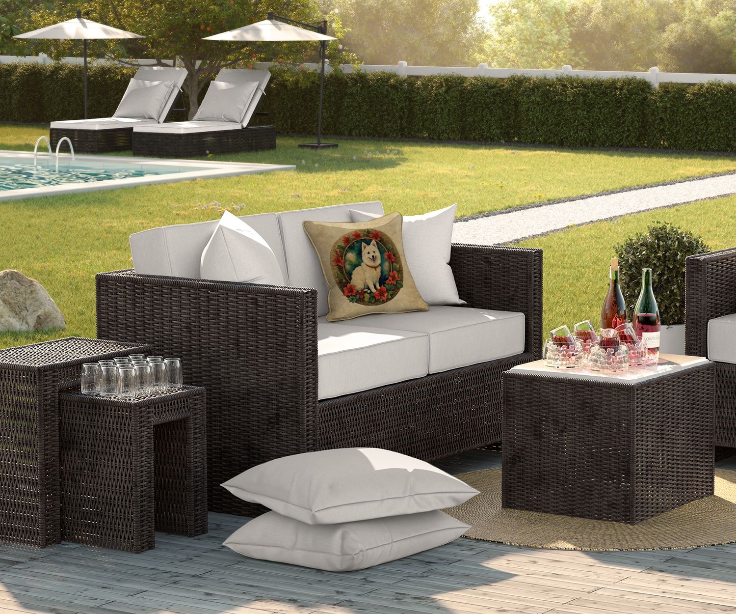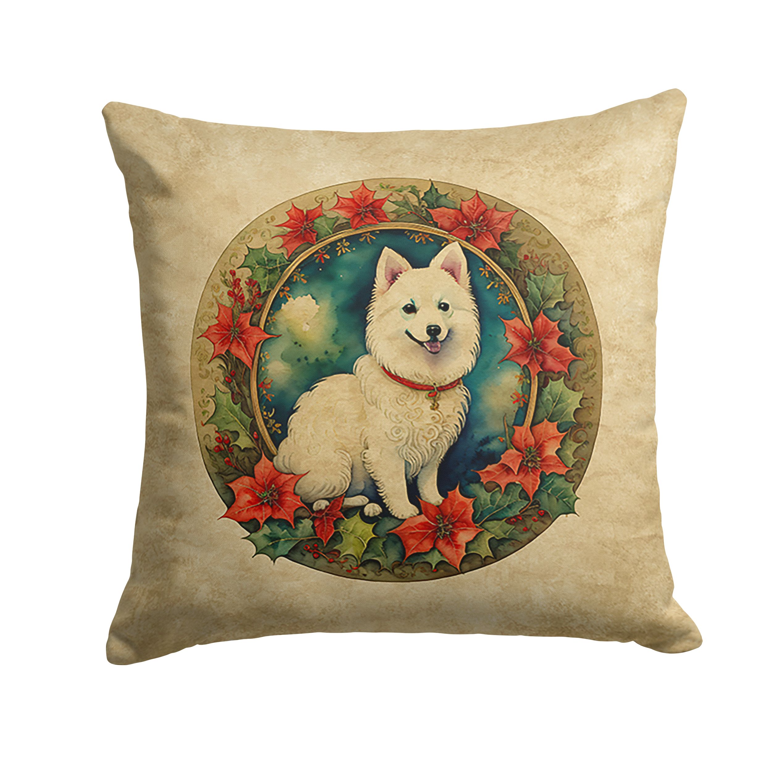 Throw Pillow featuring breed specific Japanese Spitz artwork. Celebrate Christmas with this Christmas Pillow. Revitalize your outdoor or indoor living space with Caroline's Treasures 18x18 Fabric Decorative Pillow. With a generously sized dimension of approximately 18 inches by 18 inches, this pillow makes a comfortable and aesthetic addition to any seating area. Made from a unique, water-resistant material developed by Caroline's Treasures, the pillow sham is 100% polyester fabric that's durable and ready to weather any condition. Its vibrant, full-color artwork will not fade over time as it is dyed with color-fast dyes. Whether you place it on your patio furniture, porch, veranda, or indoor couch, its soft canvas fabric ensures a cozy experience. The pillow is handcrafted in the United States, featuring a sham created from three pieces of fabric and a polyester insert for enduring shape and overstuffed comfort. Despite being robustly built to endure the outdoors, it is as soft and snug as your favorite indoor cushions. Please note, as all our pillows are handmade, sizes may vary slightly, adding to the charm of this unique decorative item.