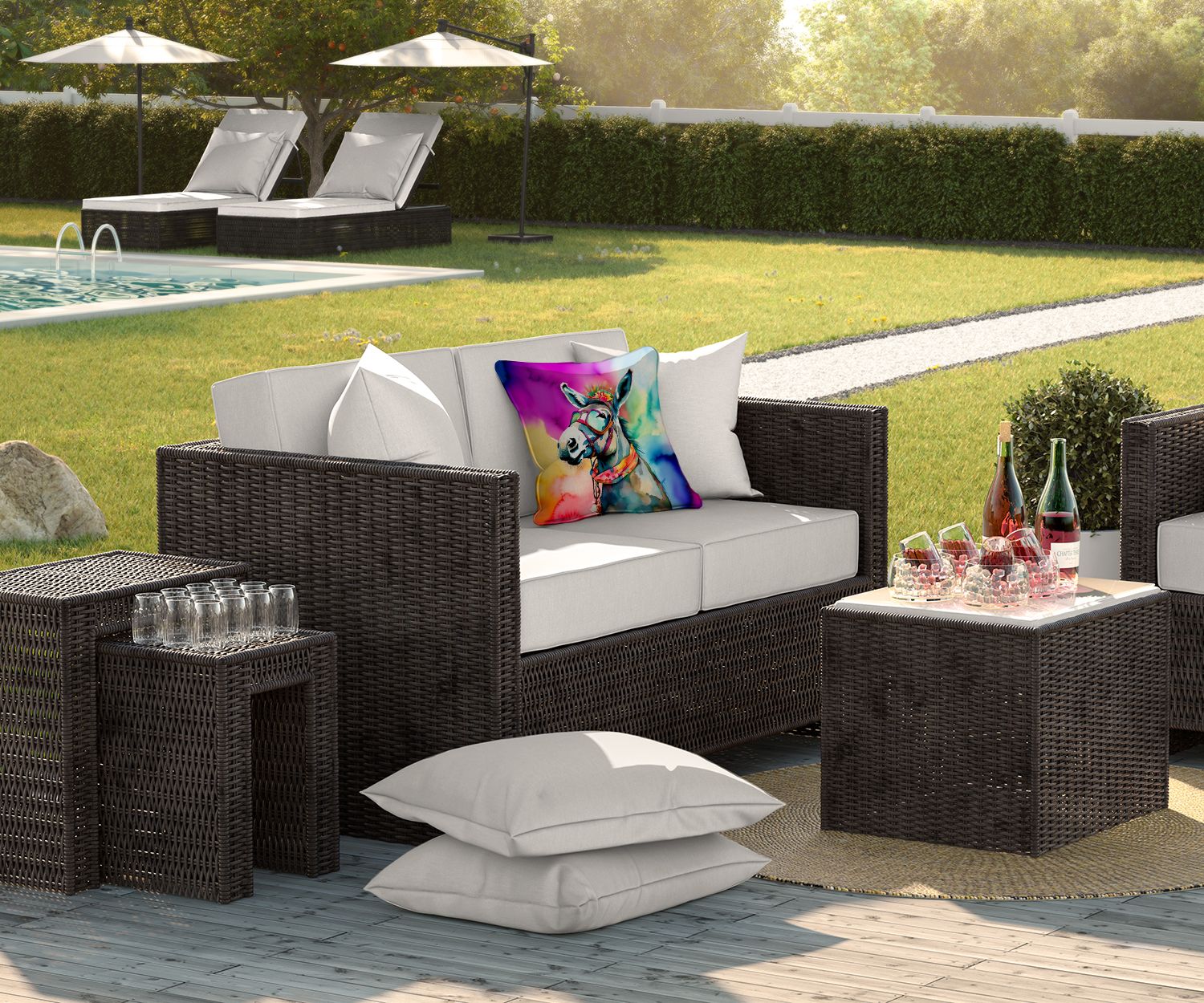 Throw Pillow featuring breed specific Donkey artwork. Revitalize your outdoor or indoor living space with Caroline's Treasures 18x18 Fabric Decorative Pillow. With a generously sized dimension of approximately 18 inches by 18 inches, this pillow makes a comfortable and aesthetic addition to any seating area. Made from a unique, water-resistant material developed by Caroline's Treasures, the pillow sham is 100% polyester fabric that's durable and ready to weather any condition. Its vibrant, full-color artwork will not fade over time as it is dyed with color-fast dyes. Whether you place it on your patio furniture, porch, veranda, or indoor couch, its soft canvas fabric ensures a cozy experience. The pillow is handcrafted in the United States, featuring a sham created from three pieces of fabric and a polyester insert for enduring shape and overstuffed comfort. Despite being robustly built to endure the outdoors, it is as soft and snug as your favorite indoor cushions. Please note, as all our pillows are handmade, sizes may vary slightly, adding to the charm of this unique decorative item.