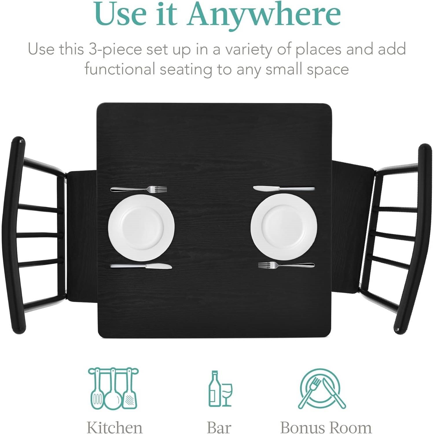 This Modern 3-Piece Metal Frame Dining Set with Black Wood Top Table and 2 Chairs has a beautifully finished composite MDF wood and a sleek metal frame provide a stylish look and sturdy design that can hold up to 286 lbs. per chair. A sleek, compact design with a 1.57in thick table top lends itself to any space in your home-use it in your breakfast nook, patio, bar, sunroom, or bonus room and enjoy! A metal frame with wood seats and PVC-coated table top is easy to wipe clean when there are spills or messes. Chairs slide under the table to save space and create a tidy atmosphere, perfect for a small apartment or clearing room for kids to play. This table boasts a 132-pound weight capacity that's great for eating dinner, working on your laptop, or playing games with friends and family in a house or apartment; OVERALL DIMENSIONS: 29.5"(L) x 29.5"(W) x 30"(H); TABLE WEIGHT CAPACITY: 132 lbs.; CHAIR WEIGHT CAPACITY: 286 lbs.