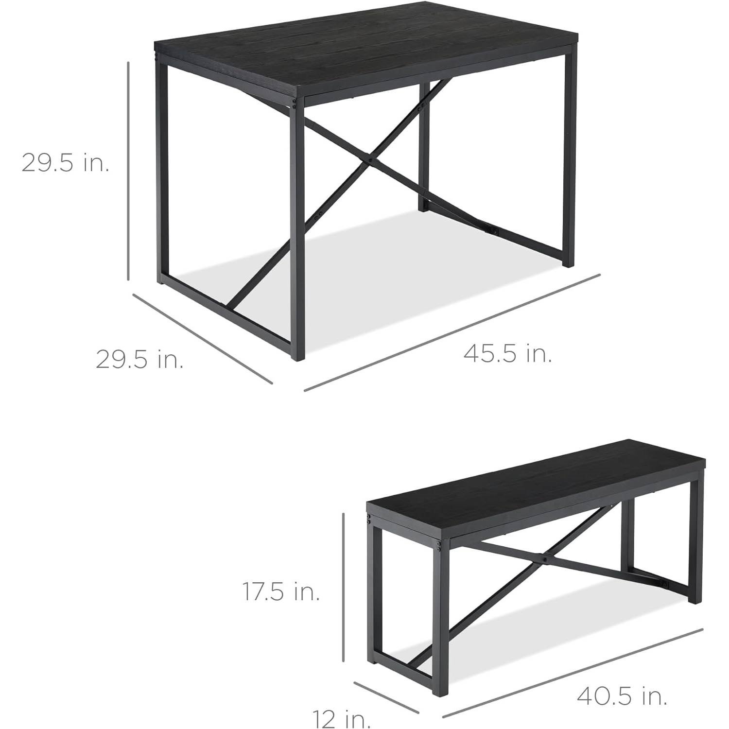 This Modern 3-Piece Dining Set - Metal Frame Black Wood Top Table and 2 Bench Chairs has two bench-style seats with a large 45.5in by 29.5in table that provides space for the whole family to enjoy. A set of three sturdy metal crossbars on the table and benches provide extra support while adding a modern industrial touch to a classic design. Engineered wood planks on the tabletop and seats provide ample support and feature an attractive wood grain finish. Slide the bench seats seamlessly under the table when not in use to maximize the space in your dining room, then slide them out for quick seating. High-quality metal and wood laminate can easily support a party of four; each seat can hold up to 500 pounds, while the table boasts a high 175-pound capacity.