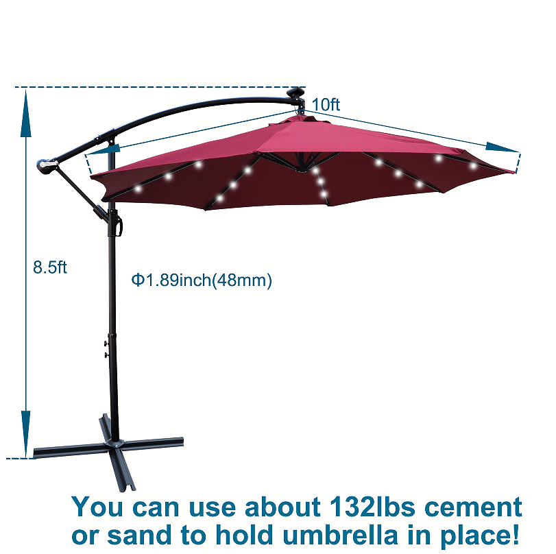 [High Quality Material]: There's no better way to sit back and enjoy the sun than with this outdoor solar LED patio umbrella from us. 100% high quality polyester canopy is waterproof, fade resistant and easy to clean. This outdoor patio umbrella has excellent materials and quality, and its waterproof and ultraviolet.