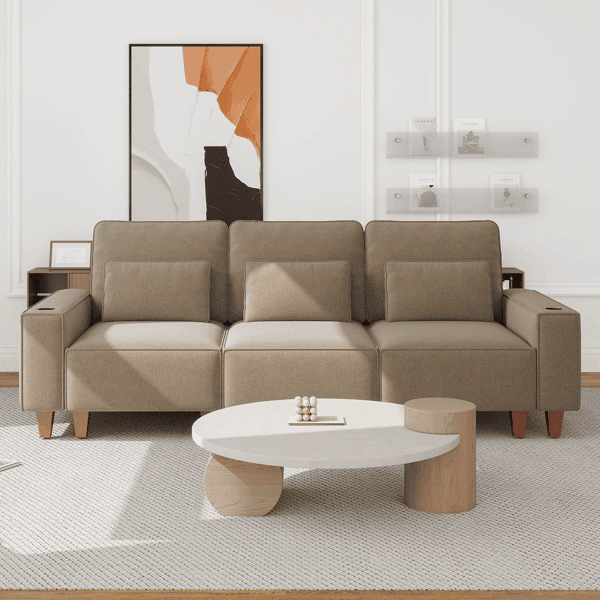 Each armrest features a brushed stainless steel cup holder, providing a convenient and elegant spot for drinks or small essentials — adding a modern, functional detail to the design. The sofa also comes with three matching decorative pillows, enhancing both the look and comfort of your seating experience.
