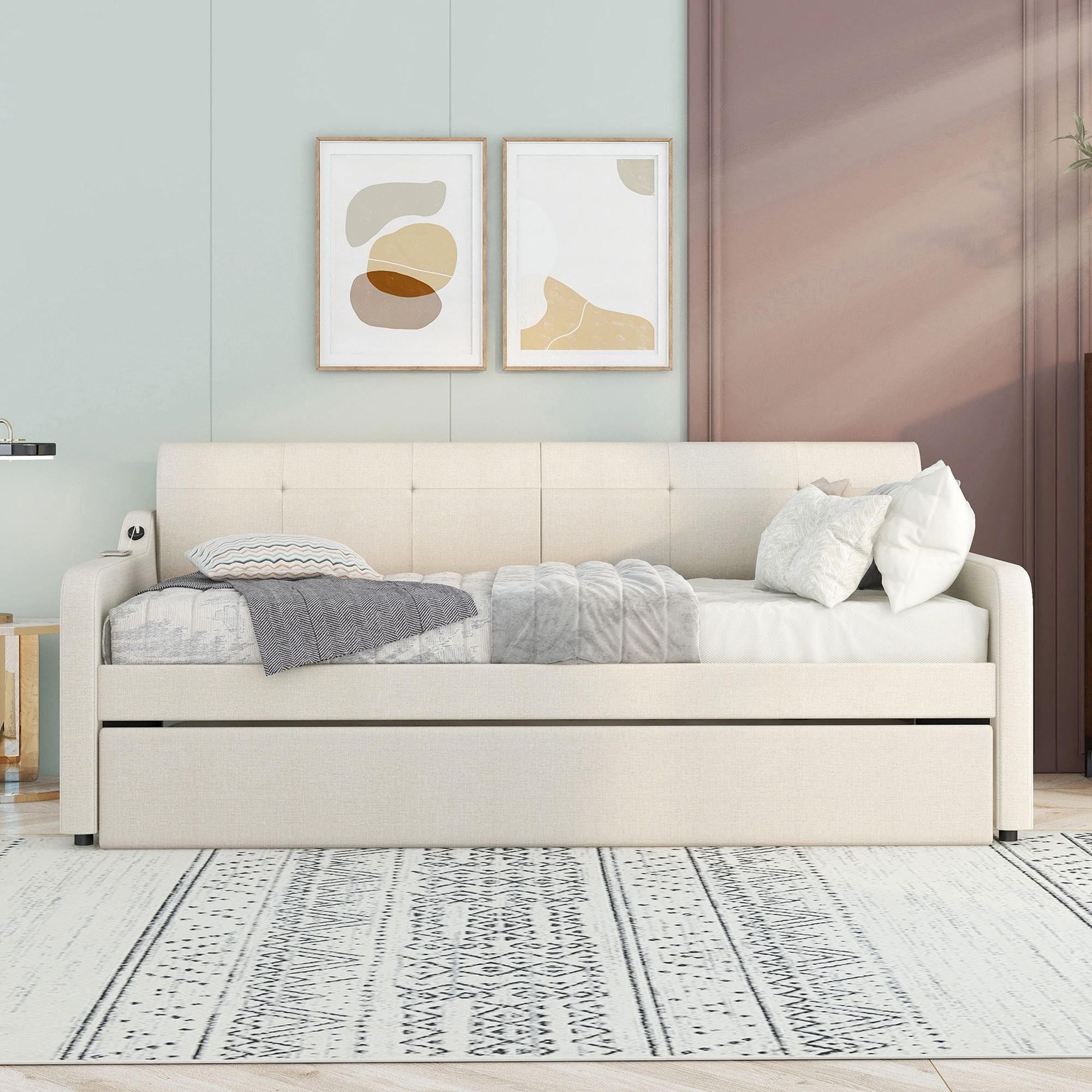 [Multifunctional Trundle] The daybed with a handy pull-out trundle takes up minimal space for the spontaneous sleepover guest.And it can be laid directly on the ground, or it can be erected at the same height as the daybed.